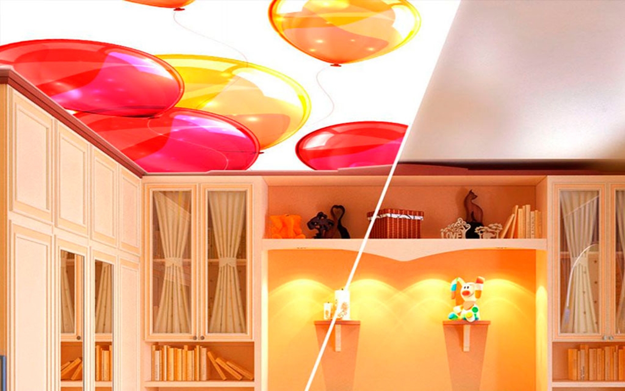 Потолок преображается при включении искусственного освещения. Происходит это благодаря скрытой подсветке внутри полотна. Светодиодные ленты крепят на специально оборудованной пластиковой панели. Диоды располагают по контуру рисунка или иным способом – все зависит от задумки дизайнера.