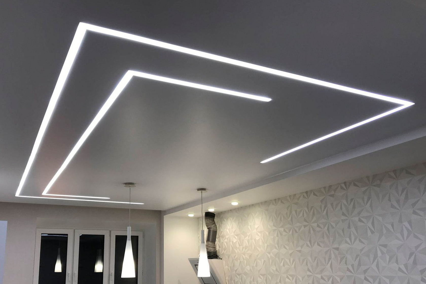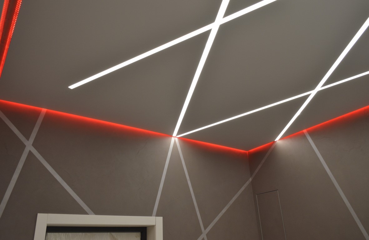 Световые линии на натяжном потолке Одинокая люстра в центре помещения даёт мало света? Точечные светильники равномерно разбросанные по помещению кажутся полумерой?