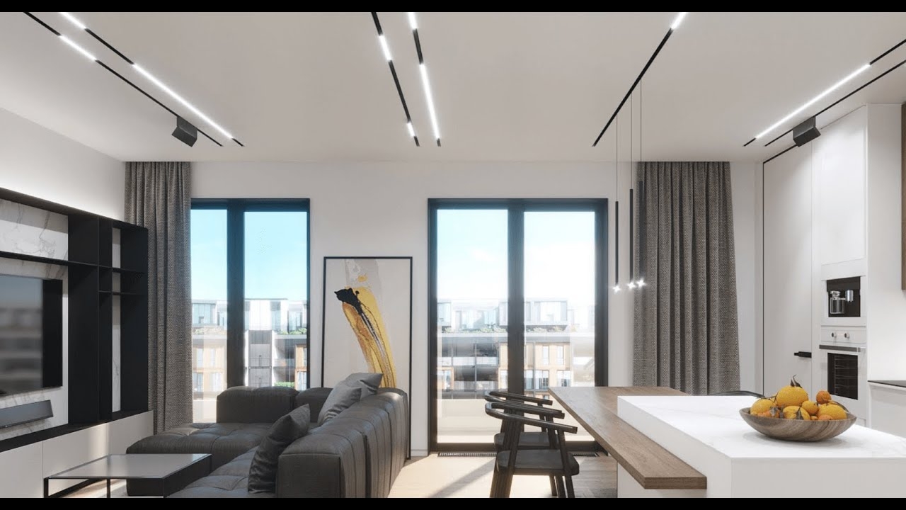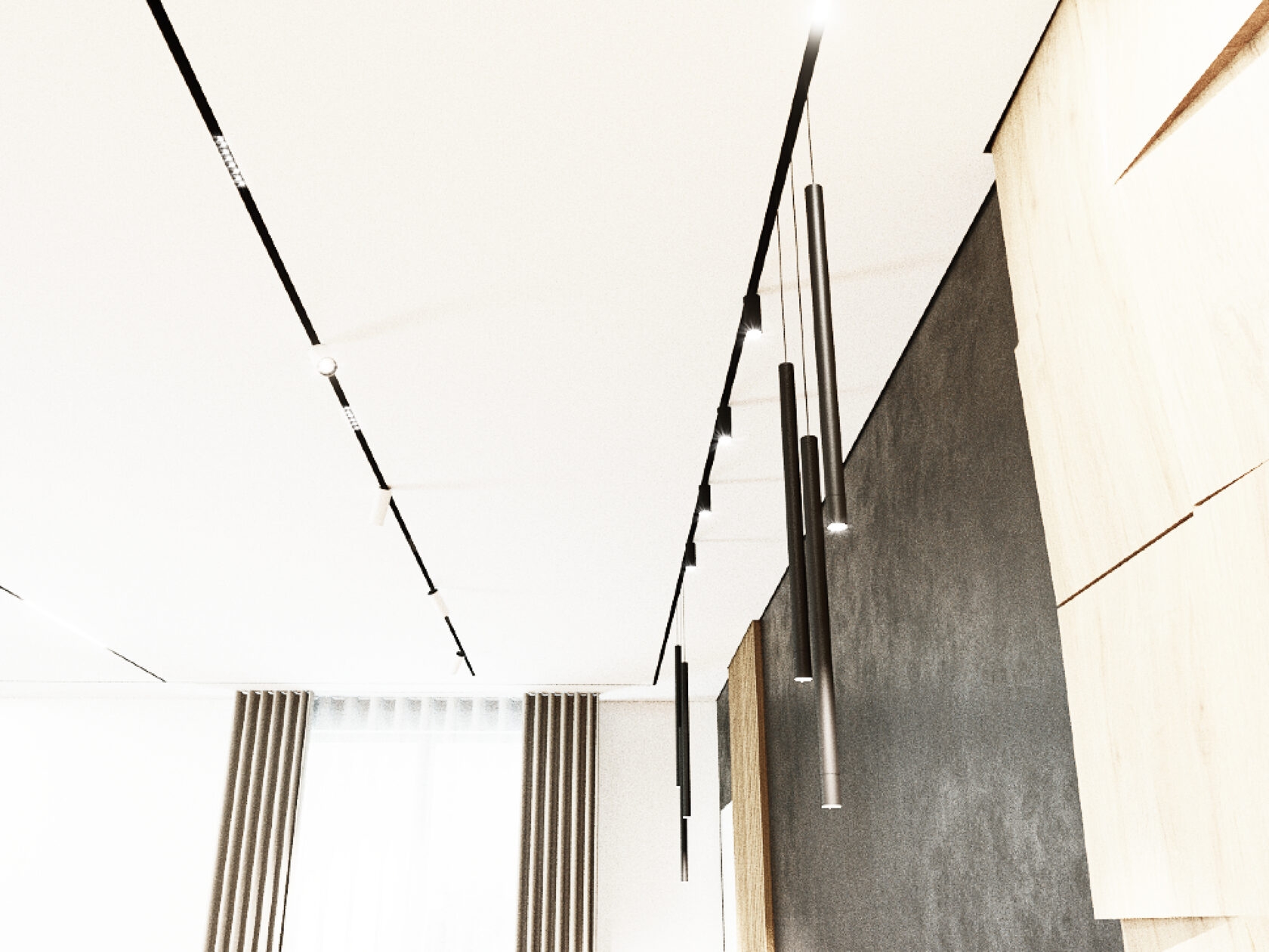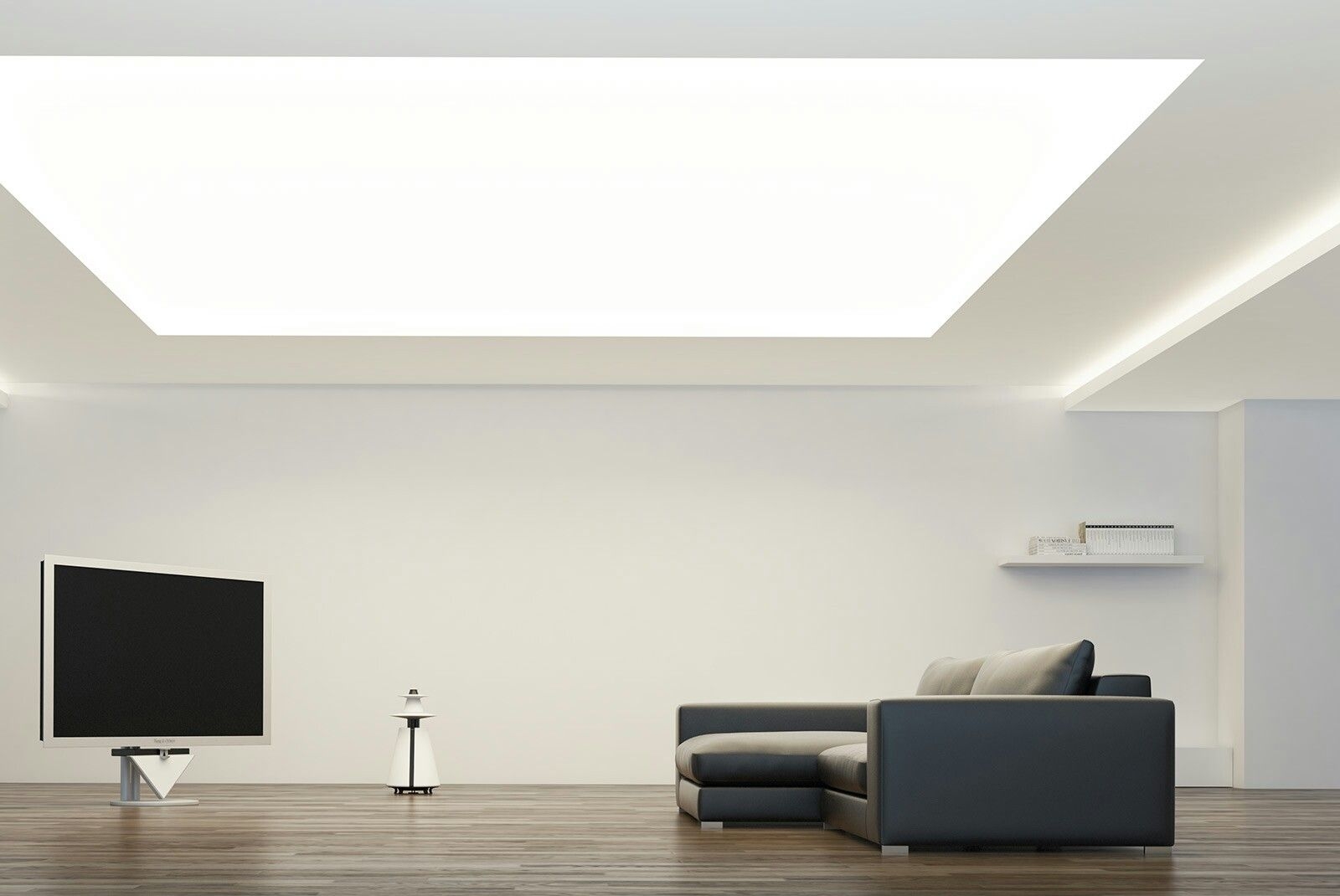 Существует несколько вариантов исполнения световых линий, и у каждого есть свои технологические и визуальные нюансы, которые следует учесть при подборе освещения. СВЕТОВЫЕ ЛИНИИ ЗАКРЫТОГО ТИПА Самый распространенный тип линий. Это световые линии, которые встраиваются в плоскость потолка. Сам профиль находится в запотолочном пространстве, а светящийся экран в плоскости полотна натяжного потолка.