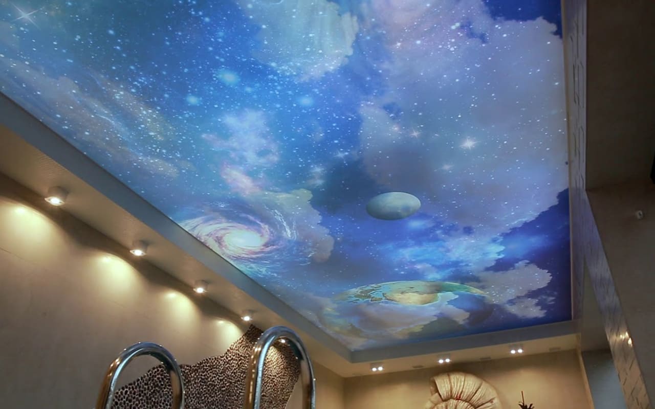 Натяжной потолок – идеальная поверхность для изображения звездного неба. Ровные потолки позволяют создавать максимально четкие, реалистичные картины. Потлки "Звездное Небо" бывают следующих типов: 1)ЗВЕЗДНОЕ НЕБО ФОТОПЕЧАТЬ Самое простое – это рисунок звездного неба на натяжном потолке. Это может быть потолок космос. Это может быть натяжной потолок ночное небо и тд. На полотно натяжного потолка перед его установкой наносится изображение звездного неба при помощи широкоформатного принтера. Далее потолок устанавливается как обычно. То есть это потолок с рисунком звездного неба. Ничего сложного. 2)3D ЗВЕЗДНОЕ НЕБО По сути это разновидность натяжного потолка с фотопечатью, но потолок натягивается в 2 слоя друг под другом на расстоянии нескольких сантиметров, причем нижнее полотно прозрачное с акцентным рисунком, а верхнее полотно, как правило с фоновым рисунком. Тогда изображение на нижнем полотне как бы висит в воздухе, создавая эффект 3D. Например этот может быть планета на фоне космоса. Кстати, пространство между двумя слоями натяжного потолка можно подсветить, расположив светодиодную ленту по периметру, в этом случае получится дополнительный эффект - натяжной потолок звездное небо с подсветкой. 3)ЗВЕЗДНОЕ НЕБО С БУЛАВКАМИ СТАРПИНС (STARPINS) Сначала на черновой потолок устанавливается светодиодное освещение, затем натягивается натяжной потолок в 2 слоя. Верхний – светоблокирующий, нижний – рабочий, тот который мы видим. На нем также может быть нанесен рисунок звездного неба, а может и нет, кому как нравится. Так получается натяжной потолок с эффектом звездного неба. Кстати, может быть рисунок не только звездного неба, а какой-нибудь другой узор. Тогда это будет уже не звездное небо, а светящийся рисунок, но по той же технологии старпинс.